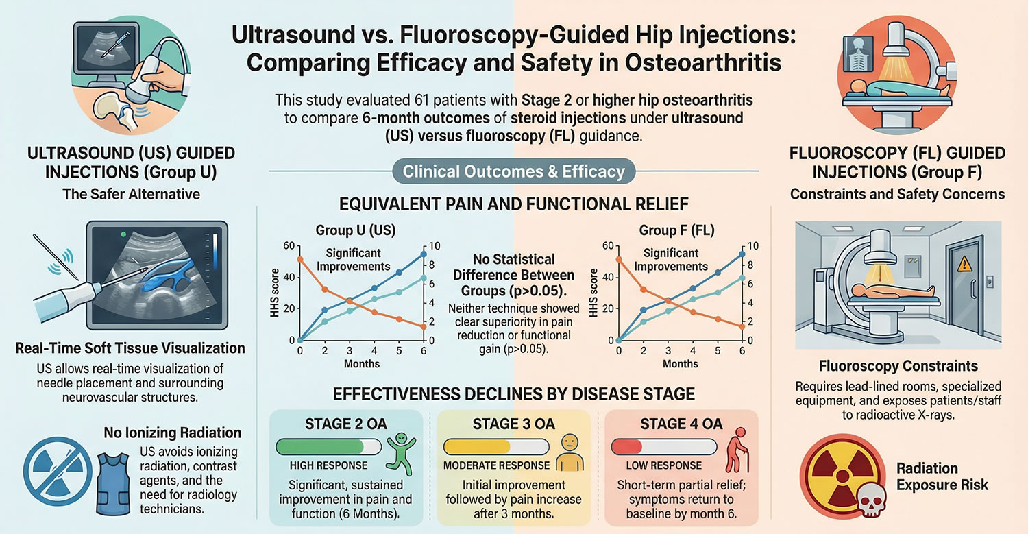 Conclusion: Both US-guided and FL-guided steroid injections resulted in significant pain reduction and improved functionality in patients with osteoarthritis. No clear superiority was observed between the two techniques. Treatment was most effective in patients at earlier stages of the disease, with efficacy declining as the disease advanced. Additionally, US is a safer imaging modality compared to FL, as it does not involve exposure to ionizing radiation.